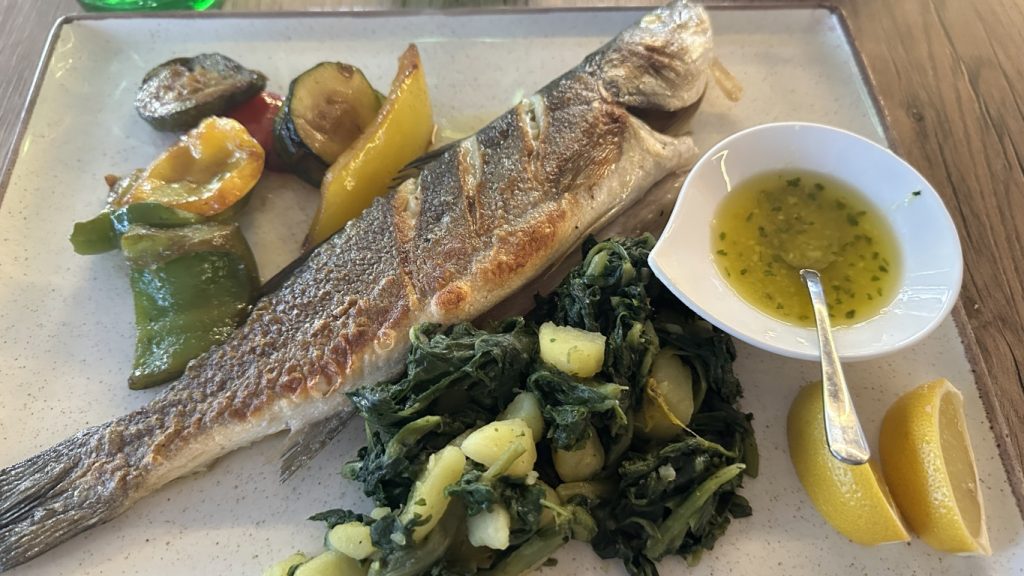 Grilled trout → served with Swiss chard (blitva) and potatoes, seasonal grilled vegetables, and a light garlic-parsley sauce. Fresh, simple, and authentically Mediterranean.