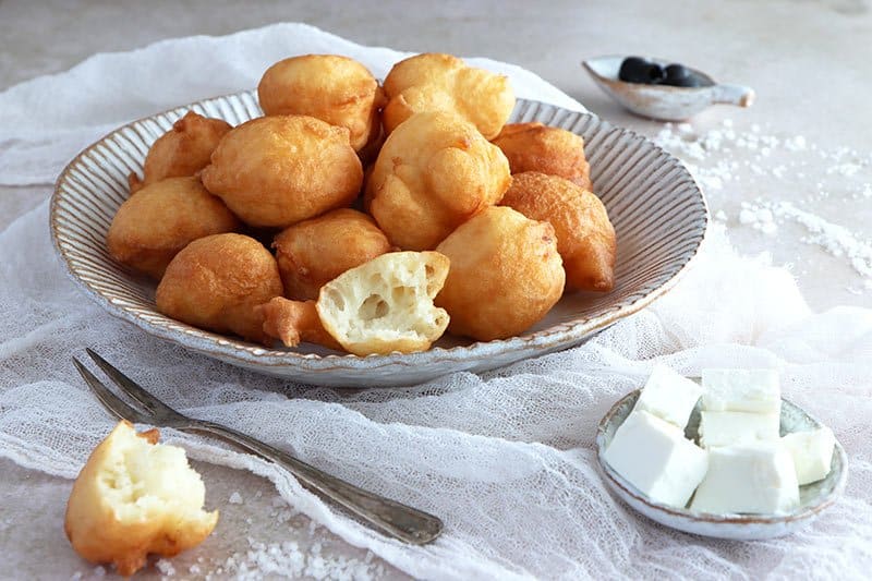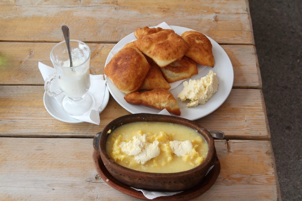 A true taste of Herzegovina: uštipci (fluffy fried dough) with creamy kajmak, warm palenta topped with cheese, and a glass of kiselo mlijeko (sour milk).